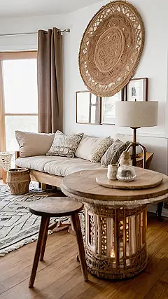 **Paragraph 1:** Whoa, check out this living room! It’s like stepping into a chill, bohemian dream. That giant woven wall hanging is seriously awesome – it’s like a giant, stylish macrame coaster for the universe! And the coffee table? It’s got a personality all its own, looking like it wandered in from a faraway land with its cool, rustic wood. Seriously, I bet this room smells like incense and good times. It’s the perfect spot to crash after a long day of…well, whatever grade 9ers do these days (besides homework, of course!).