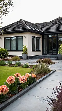 This home definitely understands the power of curb appeal! The dark roof contrasts beautifully with the light-colored house, and the patio is the perfect spot for a summer barbecue or just relaxing with a good book. Imagine the feeling of cool paving under your feet after a long day at school, followed by the sweet scent of those roses. It’s the kind of place where you could happily spend all your time, either lounging on the patio or digging in the garden. It proves that a beautiful home front garden isn’t just pretty, it’s also the perfect place to unwind and enjoy the little things in life.