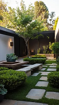 Strolling through this garden feels like playing hopscotch on fancy stepping stones surrounded by bushes that look like giant green meatballs – totally ready for some chill time. It’s got that cool, simple vibe, like a secret spot you’d find hidden away, maybe in Italy somewhere, but without having to fly over or deal with jet lag. You could totally imagine just flopping down on that stone bench and watching the trees sway, letting all your worries about pop quizzes just evaporate into the sunshine.
