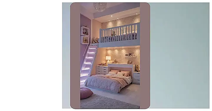 Step aside, basic bunk beds! This isn’t just a place to crash; it’s a multi-story palace where sleep reigns supreme. With levels like a fancy cake and twinkling lights that make the ceiling look like a private galaxy, this luxury kids bedroom makes your average room look like a cardboard box. Plus, it comes with a built-in audience of plush toys β probably judging your life choices, but in a cute way.