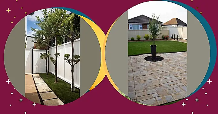 This backyard is seriously rocking the “home front garden” vibe! Check out that awesome patio – it looks like someone spilled a giant box of beige LEGOs, but in a really stylish way. And that little tree in the fancy pot? It’s like the patio’s VIP guest, all dressed up and ready for a garden party. I bet the homeowner spends hours out there, maybe sipping lemonade and pretending to be a super-chill garden gnome.