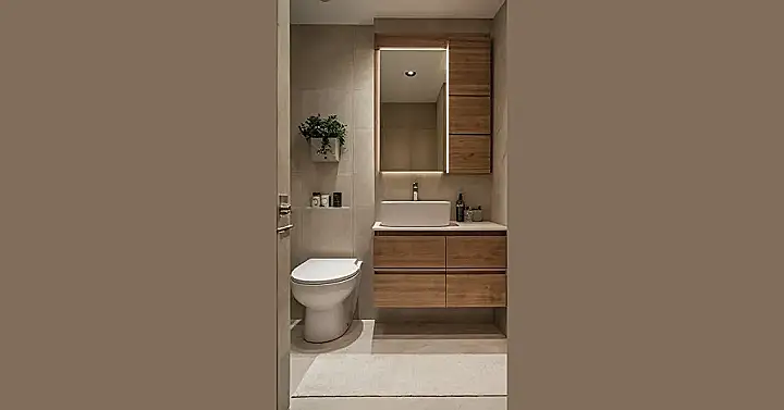 Whoever designed this little room knew what they were doing! They managed to cram everything in there without making it feel claustrophobic, which is a total win. The wood tones and simple colors make it feel really chill and modern, too. It just goes to show that you don’t need a mansion bathroom to have a space that’s both functional and totally Instagrammable.