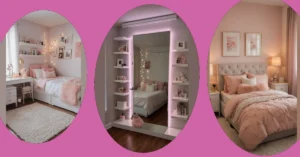 Below all that reflective glory, there’s a sleek table holding a very chill plant that’s probably just pretending to be low-maintenance. It’s like the plant is saying, “Yeah, I just woke up like this,” while secretly getting misted with purified water daily. And those stacks of books? They look super smart, like someone actually reads them instead of just using them to make the shelf look fancy, adding to the whole “I’ve got my life together” vibe. This entire setup creates an ultimate guide to making your room look effortlessly cool, even if the person who lives here is secretly still trying to figure out if cereal counts as dinner.