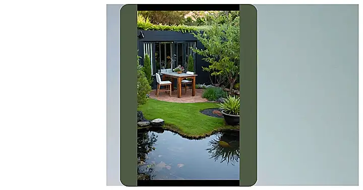 Imagine this: you’re in Canada, chilling in your own backyard oasis. This picture shows a super stylish patio area, perfect for those summer evenings. There’s a sleek table and chairs, ready for a barbecue with your friends (or just a quiet cup of tea, if that’s more your style!). The lush green grass and a tiny, tranquil pond add to the peaceful vibe – it’s like having a little piece of nature right at your doorstep! You could even pretend you’re on a fancy Canadian vacation, without even leaving home!