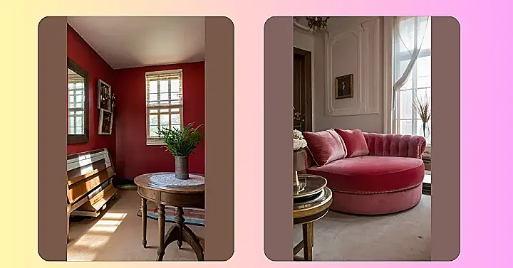 Imagine sinking into this plush, velvety chaise lounge – it’s like a giant, comfy hug! The rich red colour is seriously stunning against the soft pink walls, creating a room that’s both sophisticated and playful. It’s the perfect spot to curl up with a good book (or maybe just a giant bowl of popcorn!), and that cool abstract artwork adds a modern touch to the whole scene. This red room is clearly designed for serious relaxing.