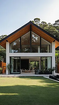 Check out this house, it looks like an architect decided to draw a house with a ruler and then bent the roof just for fun! That massive slanted roof isn’t just for show; it gives this modern architecture home a super distinctive vibe, almost like it’s about to take flight. With all those huge windows, you’d feel like you’re living inside a giant, super fancy picture frame, with nature as your constantly changing artwork. Hope they have a really good window cleaner on speed dial, or maybe a super-long squeegee!