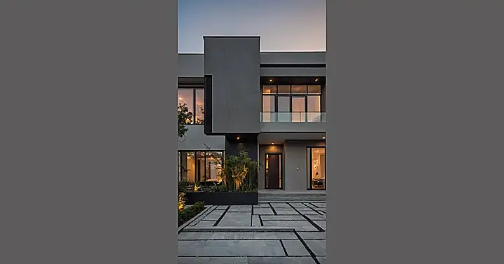 And when the sun dips, this place really knows how to glow up! Those warm lights peeking out from behind the huge windows make the whole grey exterior feel super cozy, almost like it’s winking at you. The pathway leading up to the door? It’s not just a path; it’s a cool, abstract puzzle made of stones – probably designed to make you feel like you’re stepping into a high-tech hideout. Forget boring old picket fences; this modern pad uses clever lighting and sharp angles to show off, making it the kind of home where you’d totally feel like the main character in your own awesome movie.