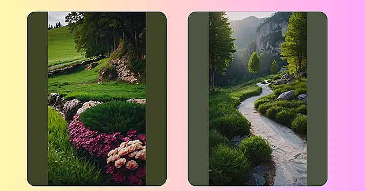 This picture reminds me of a magical place where everything is always fresh and vibrant. There’s something calming about seeing so much green, like it’s a hug from nature itself. And with the babbling stream running through the middle, it feels like this place is humming with its own kind of music. It’s almost enough to make you want to jump into the picture and explore!