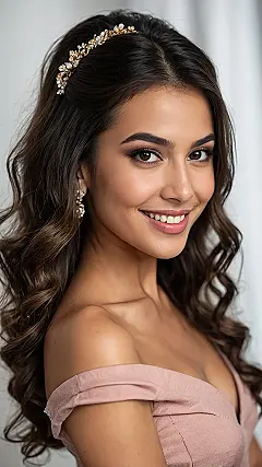 And what’s the secret ingredient to making these waves extra special? That dazzling hair accessory, of course! It’s like a tiny crown, tucked perfectly into her hair, ready to catch every bit of light and probably distract people from how perfectly she did her homework. This whole look, from the beautiful waves to that sparkle, is basically telling the world, “I’m here to shine, and yes, my hair is having a better day than yours!”