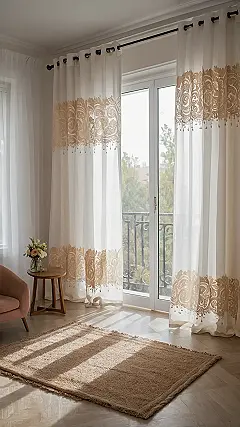 And talk about an office view! These curtains are truly living their best life, draped elegantly with that breathtaking ocean right outside their “window office.” While we’re all scrambling to find a matching sock in the morning, these majestic room curtains are just hanging out, subtly showing off their fancy embroidery and letting just enough sunlight peek through to perfectly illuminate your messy bed. They’re basically the VIP bouncers for your windows, making sure only the coolest rays (and maybe a polite seagull or two) get invited in, all while looking effortlessly fabulous.