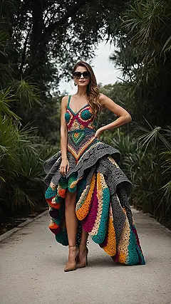 Feeling like your wardrobe needs a serious dose of joy? Well, feast your eyes on this crochet-inspired dream! This dress is like wearing a double rainbow that decided to become super chic instead of just fading away. From cool blues at the top to vibrant greens and oranges spiraling down, it’s practically a walking party. You’d definitely turn heads wearing this, probably making people wonder if you’ve got a secret stash of magical, mood-lifting yarn. Who knew feeling awesome could look this good and be totally handmade-looking?