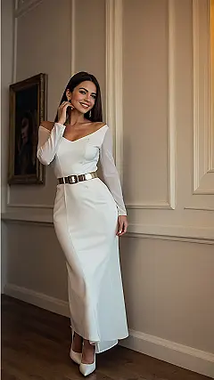 This gorgeous white dress with its off-the-shoulder style and fancy gold belt totally screams “future Mrs. Awesome” without yelling “I’m walking down the aisle right now!” It’s the perfect vibe for a bridal shower – classy, chic, and just sparkly enough to remind everyone you’re the star of the show (besides the presents, of course!). Plus, those sheer sleeves are like a superhero cape, adding a touch of elegance that says, “Yes, I can totally handle all these wedding planning questions *and* look amazing doing it.”