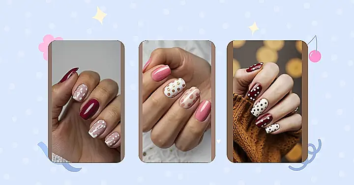 Forget trying to draw perfect tiny flowers or intricate landscapes on your nails; sometimes, the simplest patterns pack the biggest punch! What’s cool about these specific polka dot nails is how they mix things up, giving you some solid, sleek accent nails in that gorgeous burgundy while letting other nails show off their dotty personalities. It’s a fantastic way to look effortlessly chic without having to spend hours trying to get everything just right. Plus, your fingers might just become the most popular thing on your hand!