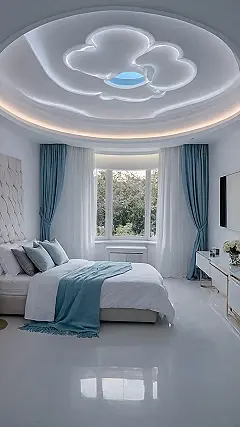 That ceiling, though! It’s like someone scooped up a bunch of cartoon clouds, lit them up, and stuck them right over your head. Plus, there’s that little sky-hole in the middle – perfect for pretending you’re peeking directly into another dimension or maybe just seeing if it’s raining outside without actually getting out of bed. And with those huge windows looking out at all that green, you’ve got nature on demand, which is way better than staring at your phone screen for hours. The super shiny floor is so slick, you could probably practice your moonwalk without even realizing it. Basically, this isn’t just a bedroom; it’s your personal, ridiculously cool, cloud-themed escape pod.