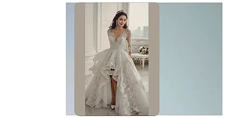 This bridal dress is seriously dreamy! Imagine walking down the aisle in this gorgeous high-low gown—it’s like a fairytale come to life. The delicate lace detailing is so pretty, it’s almost too beautiful to eat (but don’t worry, there’s plenty of cake at the wedding!). The short-in-the-front, long-in-the-back style is super unique and totally on-trend, making it the perfect blend of classic bridal elegance and modern flair—a total win-win!