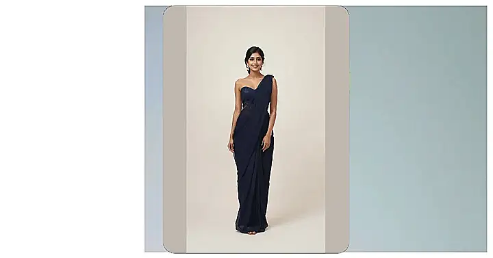 Look at this absolute queen rocking that navy blue saree! But let’s be real, the real MVP here is that *saree blouse*. It’s not just any old top; it’s practically a work of art, with its cool one-shoulder design and delicate lace details. It makes you wonder if she spent hours getting ready or if she just magically floated into this perfect look, because seriously, it’s giving major “I woke up like this, fabulous” vibes. Who knew a blouse could be so effortlessly chic and make the whole outfit pop like confetti at a party?