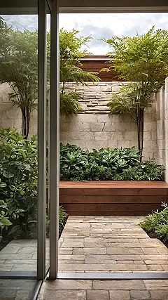 Forget those giant gardens that look like a full-time job – this awesome space proves you don’t need acres to have an epic chill zone. Peek through that glass and you’ll find a small garden that’s packed with personality, not just plants. It’s got a cool stone path, a comfy-looking wooden bench (perfect for scrolling TikTok or actually reading a book, gasp!), and enough greenery to make even your phone background jealous. Plus, who needs to mow a giant lawn when you could be relaxing right here instead, probably with a snack?
