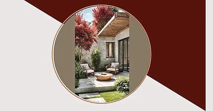 And can we talk about those trees? The bright red leaves are practically putting on a show, making the whole place feel super lively and chic, even if it’s not sprawling. It’s like someone took all the best bits of a huge forest, shrunk them down with a magic ray gun, and perfectly placed them for maximum enjoyment with minimum mowing. Plus, that clever mix of stone patio and grassy path means you get all the lushness without tracking mud everywhere after your intense fire-gazing session. It’s a genius design for anyone who wants a slice of nature without needing a map to navigate their own backyard.