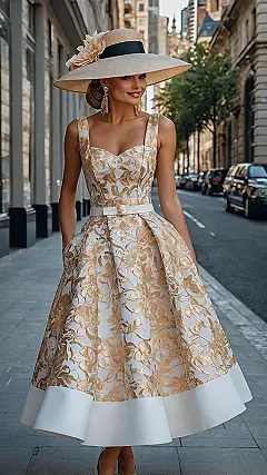 Picking the perfect derby outfit is basically like choosing your superhero costume for a fancy field trip. You need something that says “I’m here for a good time and possibly some expensive snacks,” while also making sure your hat doesn’t blow away in a sudden gust of wind or accidentally take out someone’s eye when you turn too fast. This gold and white number with the giant hat is basically saying, “Move over, horses, there’s a new main event in town!” Plus, pockets in a fancy dress? That’s just genius level design right there.