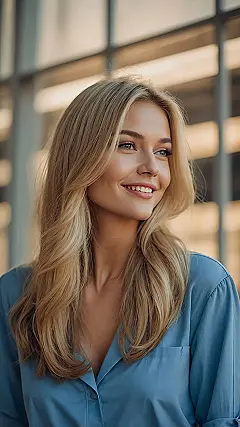 This isn’t just blonde hair; this is *creamy blonde* hair, like a perfectly whipped vanilla milkshake that looks too good to drink! Just look at those gorgeous, flowing waves – they probably have their own fan club. It’s the kind of hair that looks so smooth and shiny, you can almost hear it humming a happy tune. Plus, when your hair looks this amazing, it’s pretty hard not to rock that super friendly, bright smile, making you wonder what fabulous secret this creamy blonde dream is hiding.