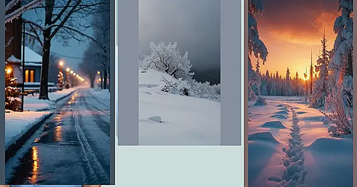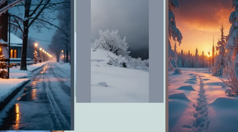 This image is like a winter wonderland collage! It’s a bunch of different pictures all put together to show you how beautiful winter can be. You can see the fluffy snow on the trees, a pretty sunset in the sky, and even some frosty branches that look like they’re sparkling. It’s like taking a peek into a magical winter world!