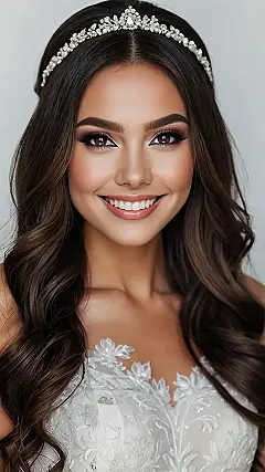 This bride is totally rocking the Hollywood waves look! Her hair is like a waterfall of gorgeousness, all shiny and wavy, and that sparkly headpiece? It’s like she’s a real-life princess getting ready for her happily ever after. Seriously, she looks like she walked straight out of a movie – maybe a rom-com where the wedding is amazing and everyone cries happy tears (except the evil stepmother, of course).