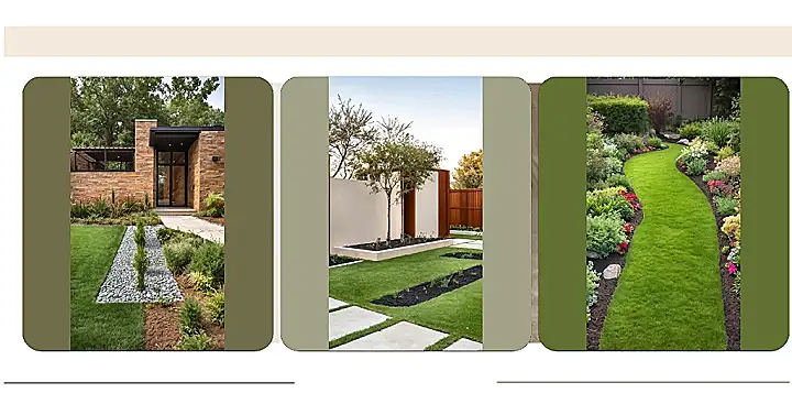 Then there are those smart details, like the chic raised garden beds where those two cool trees hang out, framed by sleek cream walls and warm wooden panels. And notice those dark strips of mulch weaving through the grass? Not only do they look super modern, but they also act like a secret weapon against weeds, making your backyard look effortlessly awesome without turning you into a full-time gardener. This whole setup shows how clever landscaping choices, from paths to plants, can transform your outdoor area into a place that’s not just pretty to look at, but also super functional and a total breeze to keep looking sharp. It’s basically an outdoor cheat code for cool.