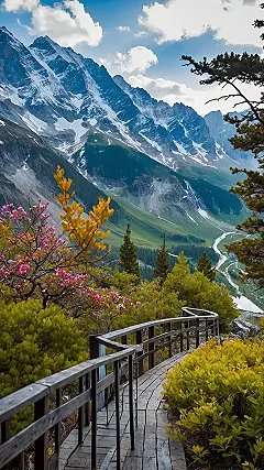 That wooden boardwalk just screams ‘adventure awaits,’ doesn’t it? It’s like a VIP pass to the most epic mountain views, letting you stroll along while all the cool flora, like those bright pink and yellow flowers, are showing off. You can almost imagine skipping down it, trying not to trip while simultaneously trying to capture the perfect shot of the valley and river below. Forget just chilling indoors this summer; places like this are proof that getting out into nature, even if it means dodging a rogue snowflake or two, is way more exciting than just scrolling through feeds.