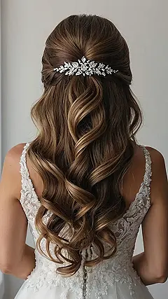 Think about it: this ‘do is like a party in the back and business in the front. The top is smooth and sophisticated, perfect for greeting guests and accepting congratulations. But then BAM! Those gorgeous, cascading curls in the back are ready to hit the dance floor and show off some killer moves. And that little blingy accessory? It’s basically the cherry on top of a perfectly elegant, wedding-ready sundae.
