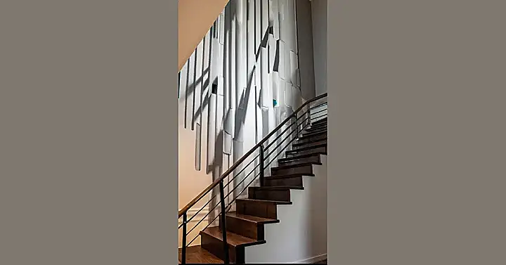 That staircase wallpaper is wild! It looks like someone stacked a bunch of paper towel rolls and then gave them a karate chop. Imagine trying to explain to your friends that your house has a “textural wall installation inspired by vertical geometry.” They’d probably just nod and smile, while secretly thinking you’re now fancy.