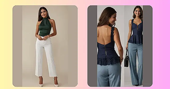This outfit is basically a masterclass in looking effortlessly amazing. Our model is rocking a sleek, emerald green halter top that practically screams “I’m here, and I brought my A-game!” Paired with those crisp, wide-leg white pants, it’s the kind of look that makes you feel like you’re starring in your own movie montage, even if you’re just walking to get a snack. It proves you don’t need sleeves to look super sophisticated; sometimes, a chic neckline is all the drama you need to make a statement and look totally put-together.