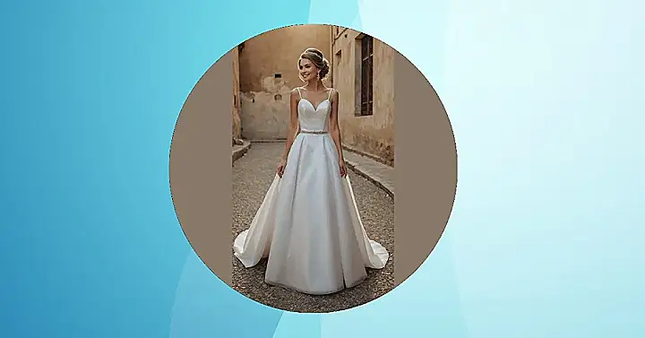 Wow, check out this dress! It’s totally giving off those classic bridal vibes, like something straight out of a fairytale or a fancy movie. That flowy skirt looks like it could fill a whole room, making you feel like a total star… or maybe just really concerned about tripping over it every five seconds. It’s got that simple, elegant look that somehow feels both super fancy and maybe just a tiny bit high-maintenance, but hey, it’s a wedding dress, right?
