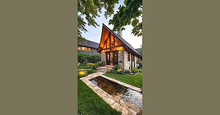 Who needs a secret clubhouse when you could have this ridiculously cool cottage? This place looks like it popped straight out of a video game where you’ve finally unlocked the ‘ultimate cozy retreat’ level. With its rugged stone walls and that super dramatic wooden peaked roof, it practically begs you to kick back. The warm, inviting glow from those windows makes you think of hot cocoa, comfy blankets, and zero internet drama – just pure, uninterrupted chill. And don’t even get us started on that awesome little stream winding through the garden; it’s practically tailor-made for contemplating life’s big questions, like ‘What’s for dinner?’ or ‘Did I leave my charger plugged in?’