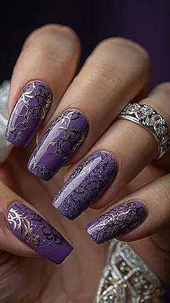 Wow, check out these purple nail art masterpieces! These aren’t just any regular manicure; these are the kind of nails that show up to a party and instantly make everyone else’s hands feel a little underdressed. The shade of purple is absolutely dreamy, like a lavender field decided to get all dressed up for a fancy ball. Then there’s the gold scrollwork, so intricate it looks like tiny golden vines decided to grow right on your fingertips, making you feel like royalty or at least someone who definitely has a secret stash of tiaras.