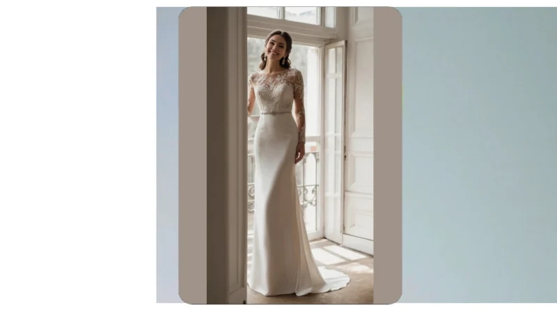 Get a load of this wedding dress! It’s got that famous “trumpet” shape, which basically means it’s super fitted until about the knee, and then BAM – it flares out dramatically like the bell of a trumpet. This style is definitely for someone who wants to make a grand entrance, maybe even requiring a red carpet and a slow-motion walk, because you’re practically floating on air. With those delicate lace sleeves and the way the silky fabric catches the light, it looks like this bride could easily be off to star in her own rom-com or, at the very least, command attention at the snack table.