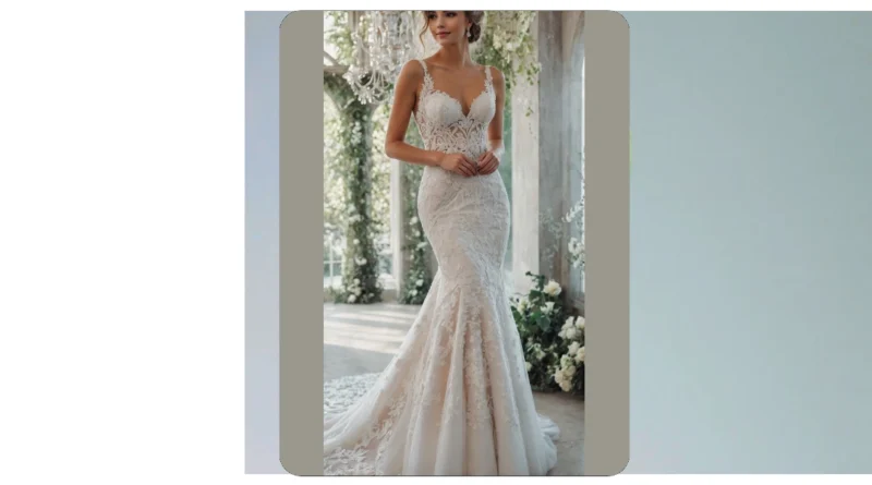 Getting married in this? You’d be sparkling brighter than a disco ball at prom, but in the most elegant, “I woke up like this” kind of way. Just look at all that intricate lace detailing – it’s practically a work of art that makes the dress glimmer, catching every bit of light. And the fitted shape? It’s so perfectly ‘mermaid’ that you might actually start wondering if you can breathe underwater! This dress looks so comfy and effortless, you could probably bust out a few dance moves without feeling like you’re wrapped in a carpet. It’s truly the kind of outfit that makes everyone gasp when you walk in, probably thinking, “Wow, she really committed to the sparkly, sea-goddess theme!”