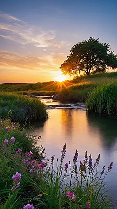 Now, let’s talk about the real stars of the show down front: those vibrant purple and pink flowers acting all cute by the water. They’re practically posing for the camera, making sure you know this isn’t just any old stream; it’s a supermodel runway for nature’s prettiest blooms! The water itself looks so smooth, like a liquid mirror reflecting all that gorgeous sky, making you almost want to dip your toes in – though probably a bit chilly for that! It’s the kind of spot where even a grumpy cat would probably crack a tiny smile. This whole scene is a perfect reminder that sometimes, the best remedy for a busy mind is just a picture that whispers, “Go play outside (or at least pretend to).”