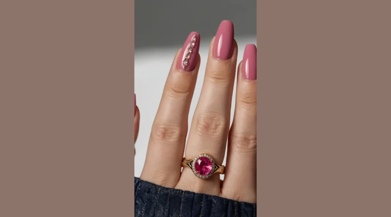 And as if the nails weren’t enough, check out that ring game! Stacked up on a finger peeking out from some super cozy-looking faux fur, those gold rings sparkle with gorgeous purple and clear stones. They totally complete the whole “I’m effortlessly glam” look. These nails aren’t just pretty; they’re a whole vibe, proving that a little pink, a little shine, and a lot of sparkle can turn any hand into a masterpiece.