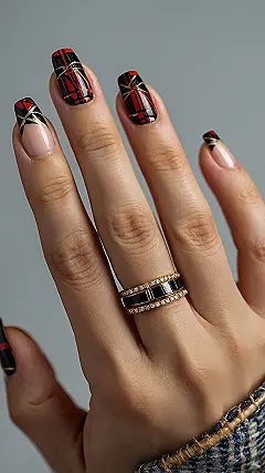 Get ready to seriously swoon because these plaid nails are basically a mini fashion show on your fingertips! With dazzling red, sleek black, and shimmering gold lines, each nail is a tiny masterpiece. We’re talking intricate checks and even a cool harlequin pattern that looks impossibly chic. If I tried this at home, it would probably look more like a kindergartener’s finger painting disaster, but these nails? They’re giving off major ‘I woke up like this, perfectly styled’ energy, especially paired with that super cozy sweater peeking into the frame.