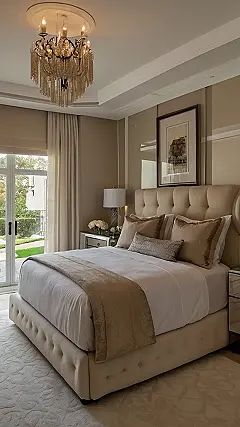 Imagine waking up in this room! It’s like living inside a giant, fluffy croissant. The beige-on-beige situation is so calming, you might actually *want* to do your homework in here. It’s so chill, even your annoying little brother would probably be on his best behavior… maybe. And that chandelier? Fancy! You could totally pretend you’re royalty while trying to find matching socks.