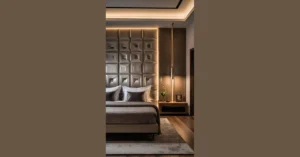 Imagine walking into your bedroom and feeling like you’re in a fancy hotel! This bedroom interior design definitely has that vibe. The cool, shiny wall is like a giant, stylish chocolate bar, but instead of chocolate, it’s probably really comfy to lean against while you’re scrolling through TikTok. Plus, the soft colors and fluffy pillows practically scream, “Come take a nap!” Who wouldn’t want to chill out in a room that looks this cozy and glamorous?