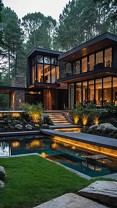Behold, the ultimate ‘forest mansion’ where luxury decided to go full nature enthusiast! This place isn’t just a house; it’s a glowing, multi-story glass masterpiece tucked so deep in the trees, you’d half expect a deer to casually walk through the living room (and honestly, it probably wouldn’t even be the strangest thing to happen here). With all those sparkling lights and the fancy pool reflecting everything, I bet the local owls gather around nightly, wondering if a new, super-cool disco has opened up in their neighborhood.