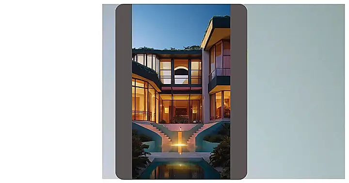 This house is like something out of a magazine! It’s all sleek and modern, with big windows that show off the fancy furniture and fancy lights inside. It looks like a place where everyone just chills and relaxes all day, maybe even with a fancy glass of juice in their hands. You can almost hear the music playing softly in the background, and see people laughing and having fun.