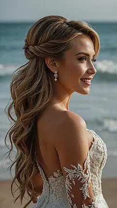 This bridesmaid is rocking a seriously gorgeous hairstyle that’s perfect for a beach wedding! Her long, flowing hair is styled in loose waves that look totally effortless. The side braid adds a touch of elegance and keeps her hair off her face, so she can dance the night away without worrying about getting strands in her mouth. It’s like a beach-meets-fairytale look, and I think it’s absolutely stunning!