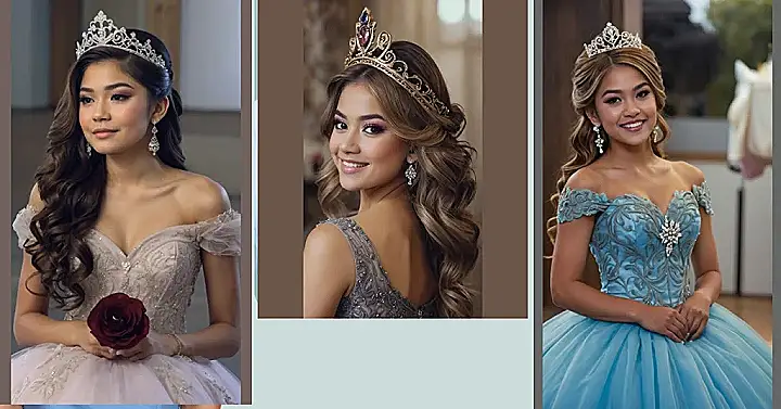 Step into a world where elegance and royalty converge effortlessly, creating a stunning tapestry of beauty fit for a quinceañera celebration. Picture cascading curls interwoven with delicate floral accents, each strand catching the light in a mesmerizing dance of shimmer and shine. A crown of enchanting crystals and pearls perched delicately atop a veil of silken tresses, radiating a regal aura that captivates all who lay eyes upon it. This majestic hairstyle embodies grace and sophistication, reflecting the essence of a young woman stepping into her royal essence on this special day.