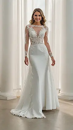 This wedding dress is like a dream! It’s a “sheath silhouette,” which means it hugs your body in all the right places, making you look super sleek and stylish. Imagine walking down the aisle in this beauty—all eyes on you! The long sleeves and delicate lace add a touch of elegance, and honestly, it looks way more comfortable than those giant, poofy dresses some brides wear. You could totally dance the night away in this without tripping over yards of extra fabric.