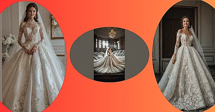 Finding your perfect dress is like finding the ultimate outfit glow-up, but for one single epic day. This beauty in the photo with its long sleeves and sparkly details looks like it took a whole team of fashion superheroes to create. You’d definitely need a few bridesmaids just to help you turn around or maybe hold the skirt while you sneak a slice of cake. It’s the kind of dress that screams ‘I’m fabulous!’ and also probably whispers ‘please don’t step on my train’ very, very loudly.