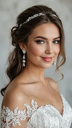 With a smile that bright, you just know this is going to be one epic wedding celebration! While “hair down” is a classic choice, this bride proves that a perfectly sculpted updo, topped with a glittering tiara and a delicate veil, can be just as classy – maybe even more so, especially if you’re planning on tearing up the dance floor without worrying about hair in your face. Her whole look, from the sparkly earrings to the fancy lace dress, just oozes elegance and pure joy, showing everyone how to truly shine on their big day, regardless of whether their hair is up, down, or somewhere in between!