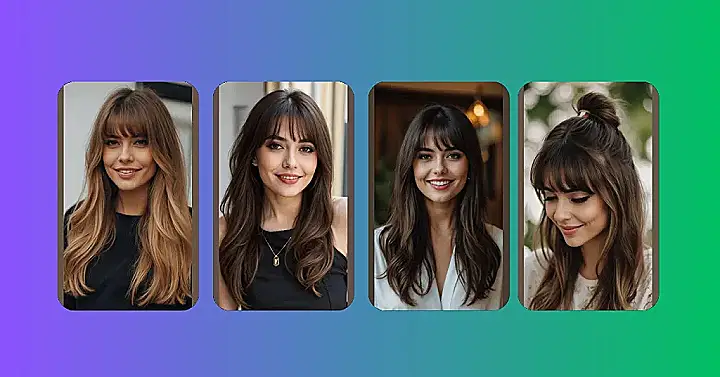 What’s super neat about curtain bangs, as you can see with our model here, is how they perfectly highlight your eyes and cheekbones without covering everything up. They’re like a stylish peek-a-boo for your best features! Whether you’ve got super long hair like hers or even a shorter bob, these bangs just work. No more trying to pin back rogue strands that refuse to behave. They’re the superhero of bangs, swooping in to save your face from looking anything less than fabulous. So if you’re tired of the same old look and want a little hair refresh that says “I’m cool, I’m stylish, and I probably didn’t even try that hard,” then curtain bangs might just be your next hair adventure!