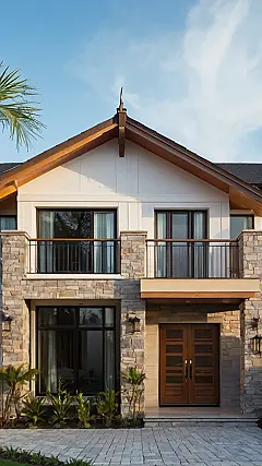 This house totally screams “fancy grandma’s house” but in a good way, like if grandma was also a super-cool architect. It’s got that classic stone and wood thing going on, but the roofline is a little bit edgy, like it’s trying to be modern while still keeping that cozy, traditional vibe. You can almost picture sitting on that little balcony up there, dramatically sipping iced tea and plotting world domination (or just finishing your homework, whatever).